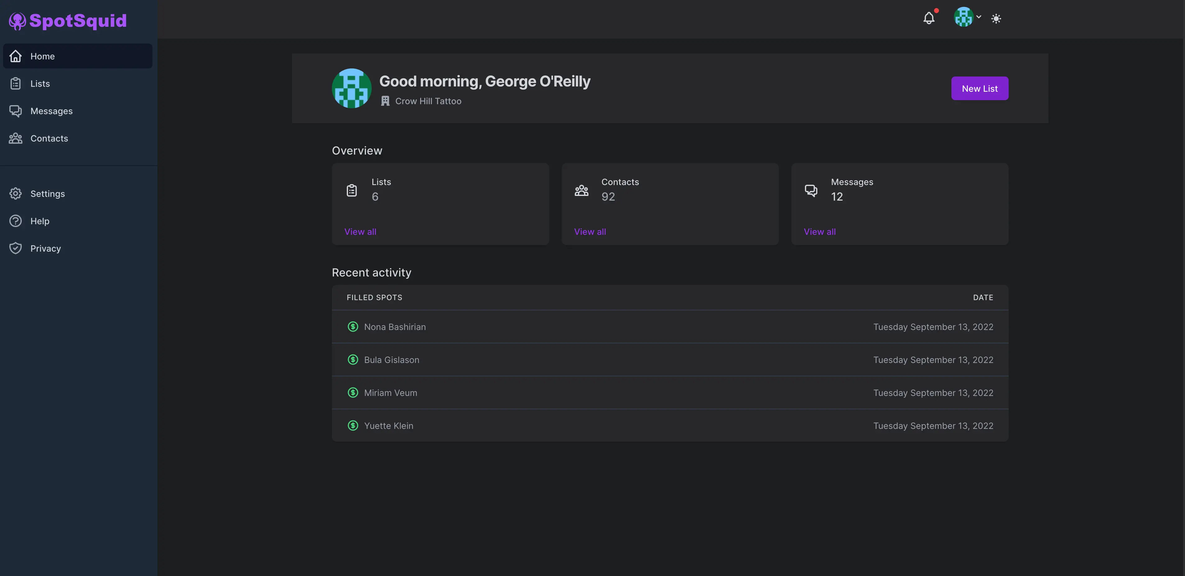 Spot Squid allows you to create and manage different list of clients. In-progress, Single Session, Waitlists are some examples of lists our artists maintain. Create a list open to the public that allows anyone to sign up to get notified when you have an opening. No more blasting out openings to thousands of people on social media platforms.